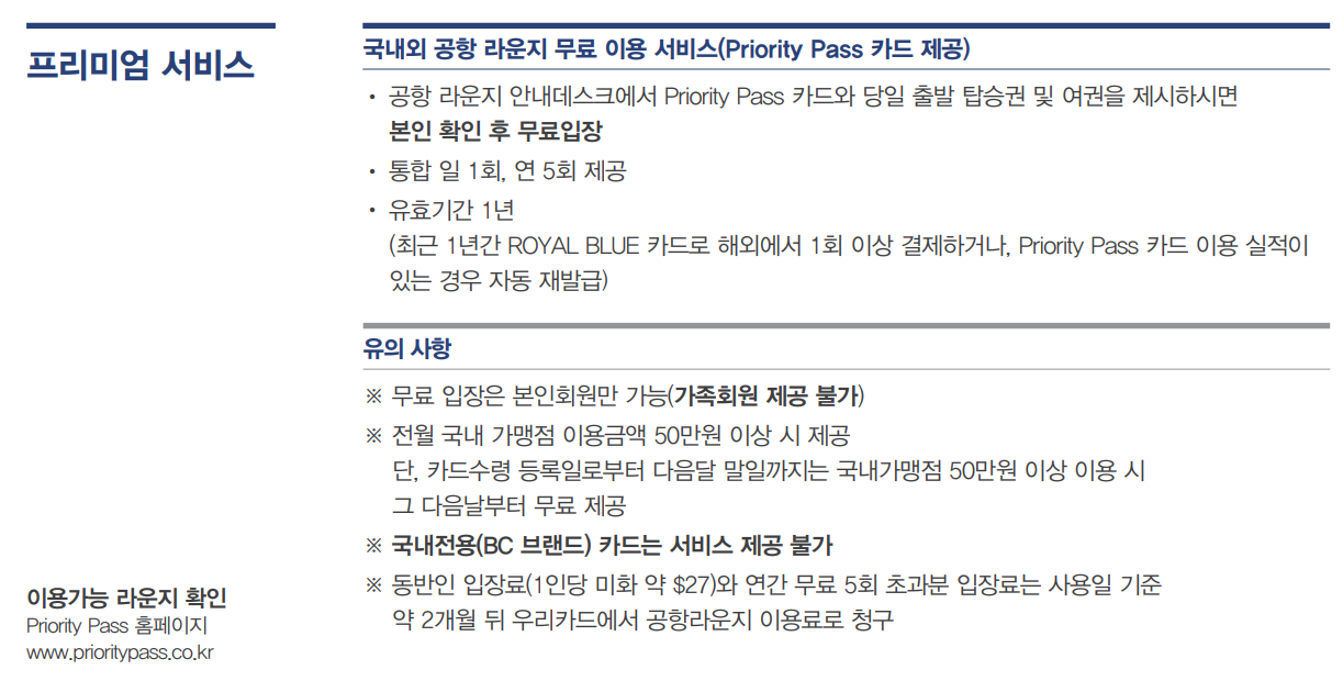 고민하시는 분들에게 유용한 정보가 되고자 우리카드의 프리미엄 라인인 로얄블루 포인트 카드 발급과 주요 혜택들을 제가 직접 사용해보며 느낀 점과 함께 정리해보려고 합니다. 올 해 상반기에 발급 받고, 해외여행도 다녀오고 잘 쓰고 있습니다.